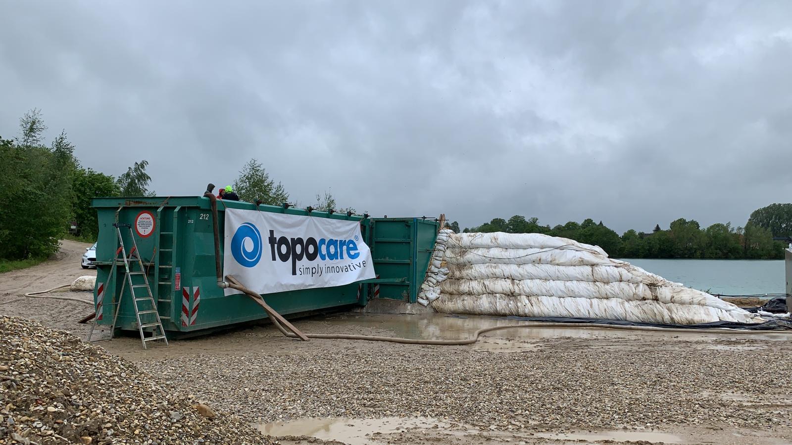 As part of the project, the Ahle company in Lage-Müssen carried out a large-scale trial at the gravel works. The aim was to test this new type of dyke and gain important insights for practical use. The company examined two separately constructed dyke cross-sections, which differ in terms of permeability and impermeability and were previously determined on the basis of laboratory tests and calculations. In order to load the two dykes, the testers set up a container perpendicular to the longitudinal direction of the dyke. During the test phase, they filled it with different water levels to simulate water masses. They then overflowed and loaded the top of the dyke to simulate driving over the dykes.