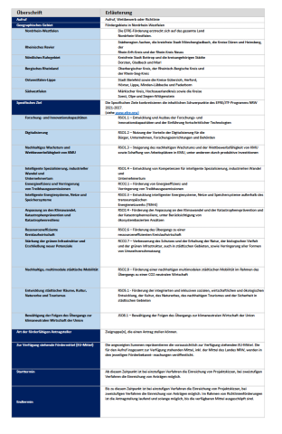Die kompakte Übersicht fasst die wichtigsten Eckdaten unter anderem zu den Zielgruppen, dem Fördervolumen sowie zu den Terminen der Aufrufe und Fördermaßnahmen zusammen.