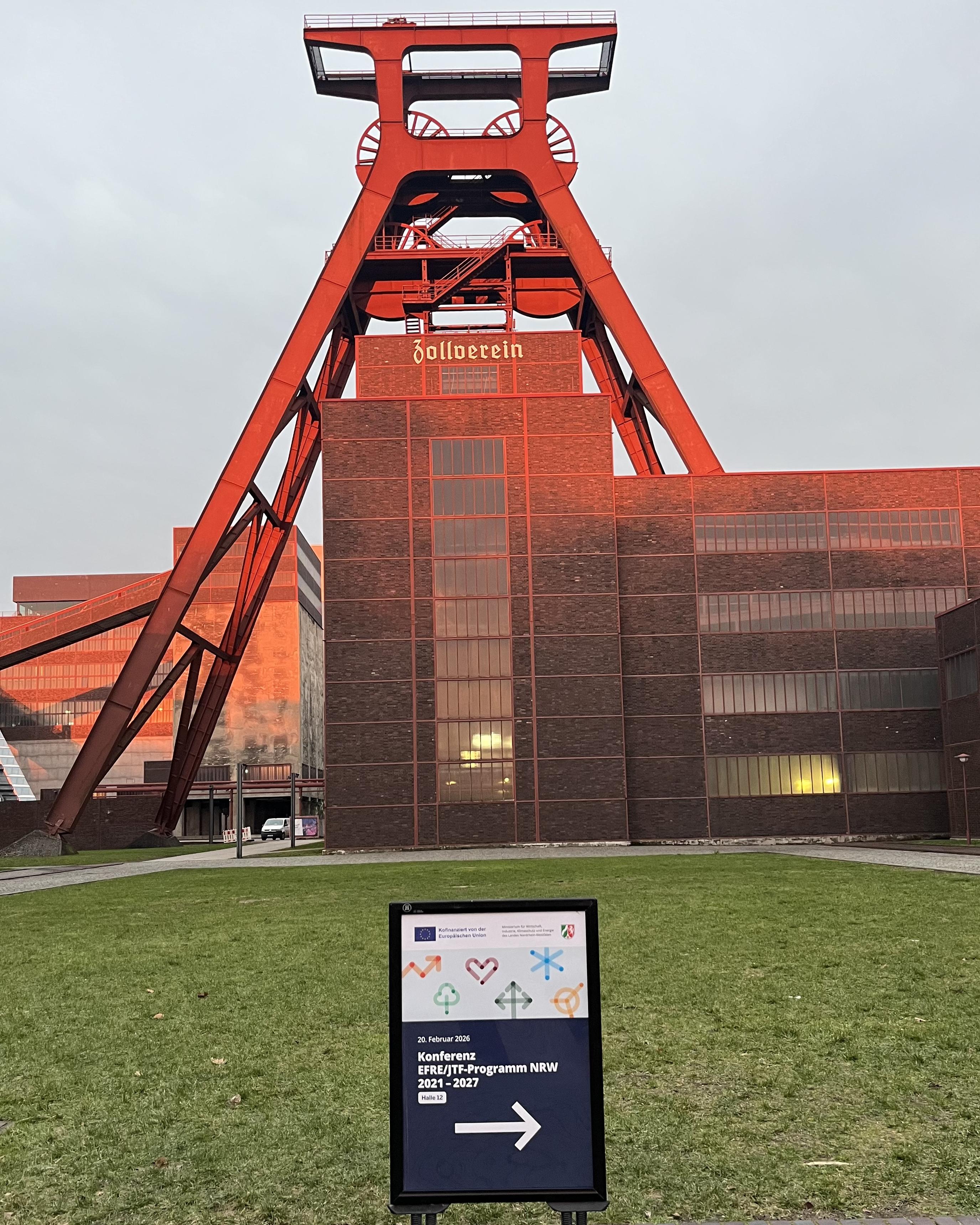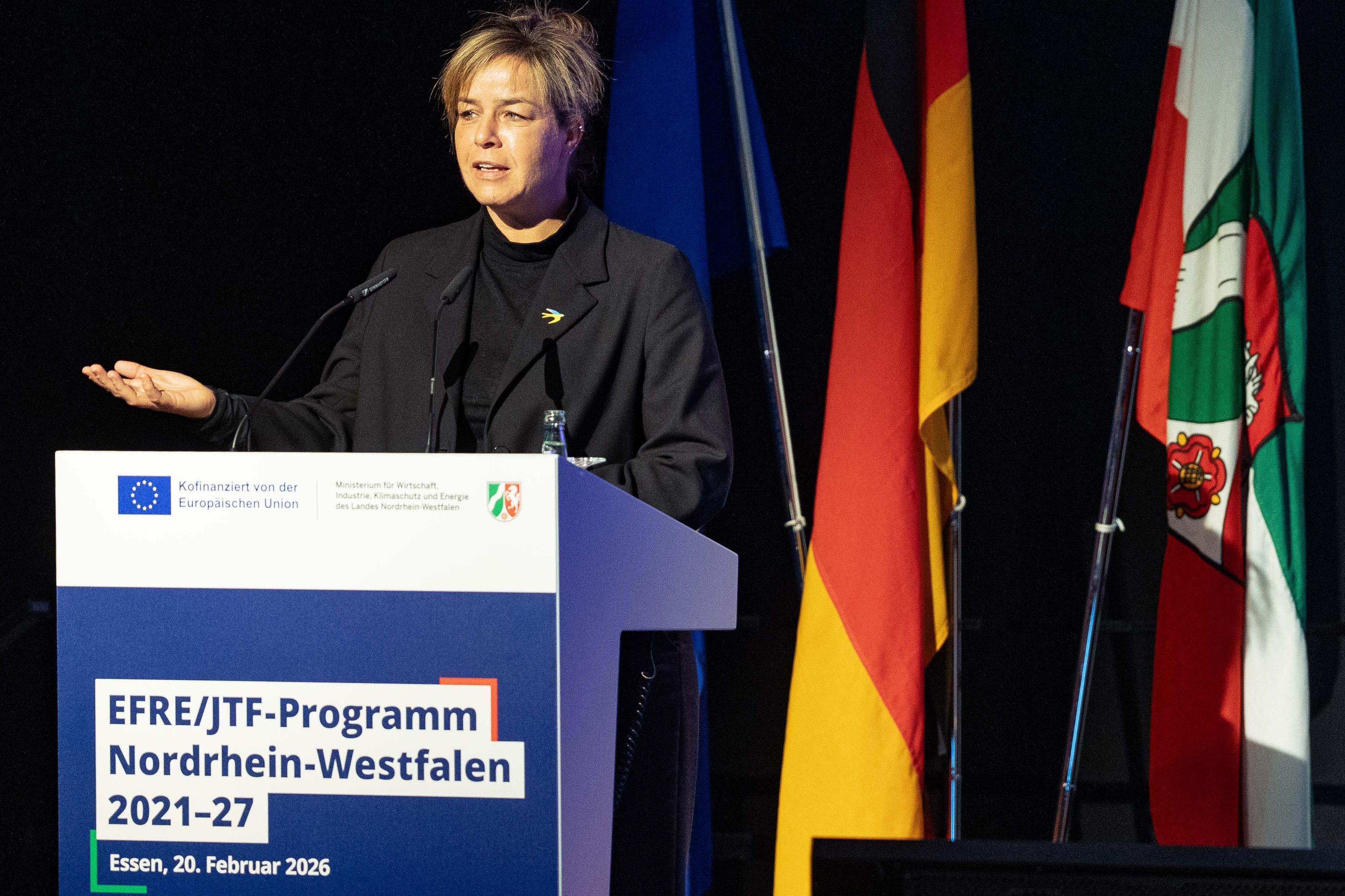 Gute Jobs,energieeffiziente Schulen, klimafreundliche Städte und innovative Unternehmen: Die Europäische Union wirkt mit ihrer Regionalförderung direkt vor der Haustür der Menschen in Nordrhein-Westfalen. Davon konnten sich etwa 400 Vertreterinnen und Vertreter aus Wirtschaft und Wissenschaft, Kommunen, Politik und Verwaltung auf der Konferenz des EFRE/JTF-Programms NRW  am 20. Februar 2026 in der Essener Zeche Zollverein überzeugen. Wirtschafts- und Klimaschutzministerin Mona Neubaur machte in ihrer Eröffnungsrede deutlich: