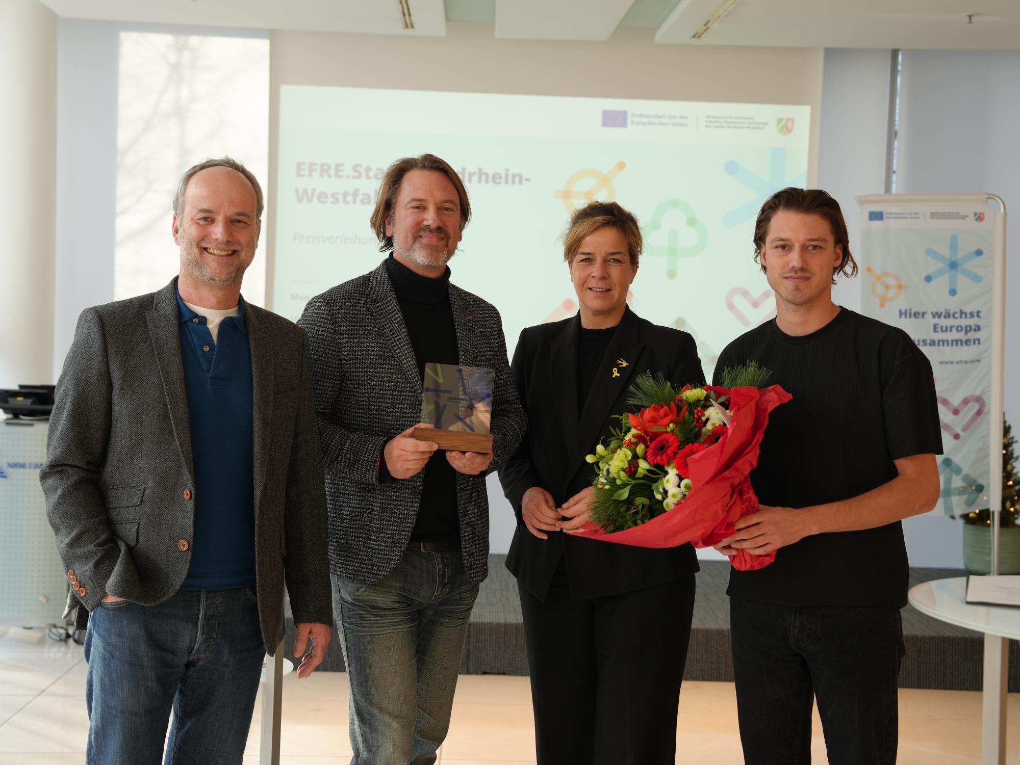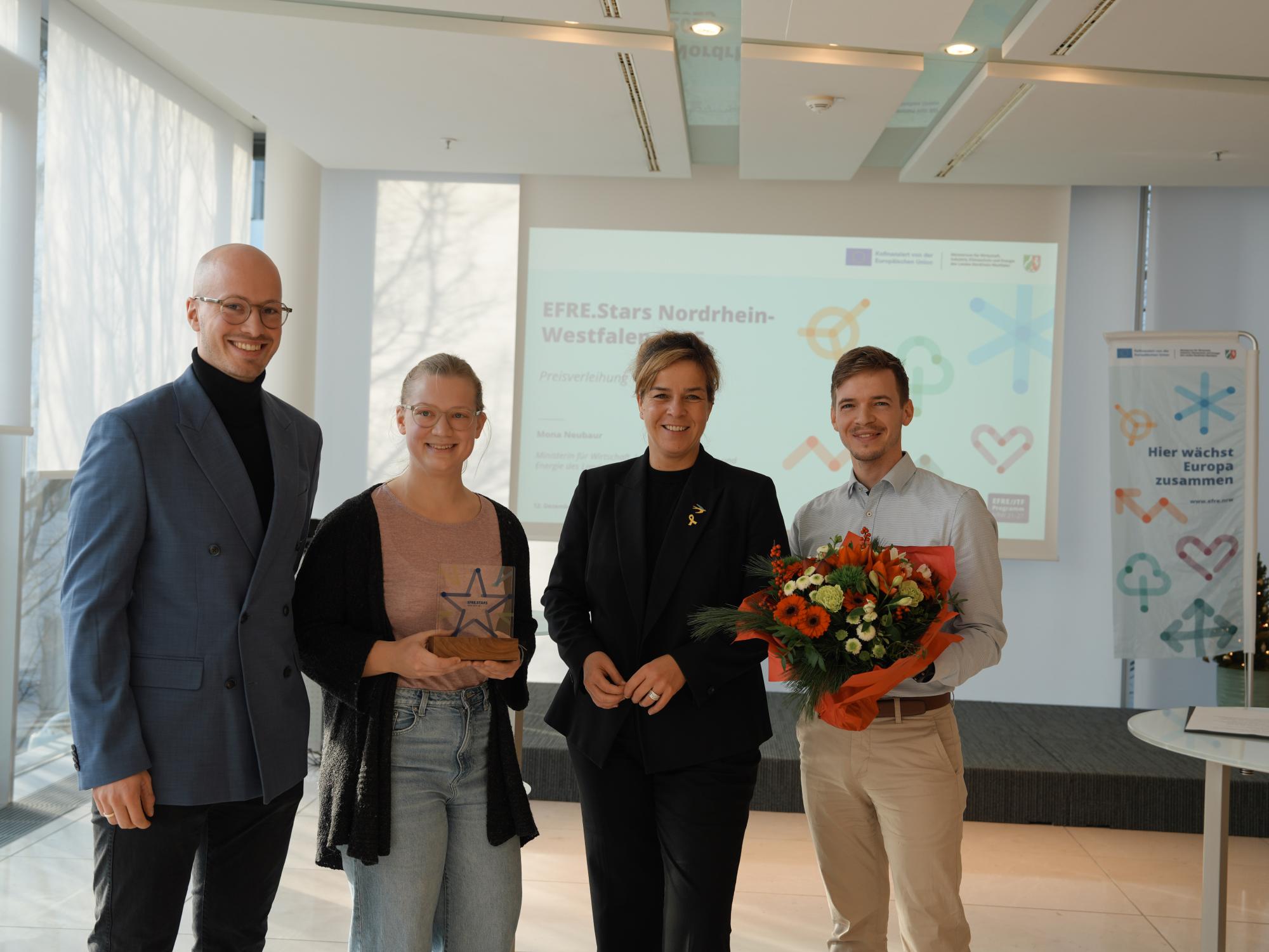 Rohstoffe für die Batterieherstellung aus Alltagsgegenständen gewinnen, Kreislaufwirtschaft im Büroalltag, ein neuer Spielplatz und Ort der Naherholung für alle Generationen, Wohnhäuser in Modulbauweise, die sich zurückbauen lassen, und ein städteübergreifendes Netzwerk für die grüne Transformation von Unternehmen: Das alles sind Beispiele für Projekte, die von der Europäischen Union und dem Land Nordrhein-Westfalen im Europäischen Fonds für regionale Entwicklung (EFRE) unterstützt wurden. Wirtschafts- und Klimaschutzministerin Mona Neubaur hat am 12. Dezember die fünf Projekte geehrt, die es ins Finale des EFRE-Stars Wettbewerbs geschafft haben und den Gewinner der Online-Abstimmung bekannt gegeben: Das „MODEL-MEHRWEG-HAUS“ aus Paderborn. Das Gründungsteam aus OWL entwickelt ein komplett rückbaubares und wiederverwendbares Gebäude in Modulbauweise. Das innovative Pilotprojekt soll den Wandel im Bausektor vorantreiben. Die diesjährigen Finalprojekte stehen stellvertretend für die Innovationskraft und den Mehrwert der EFRE/JTF-Förderung in Nordrhein-Westfalen.