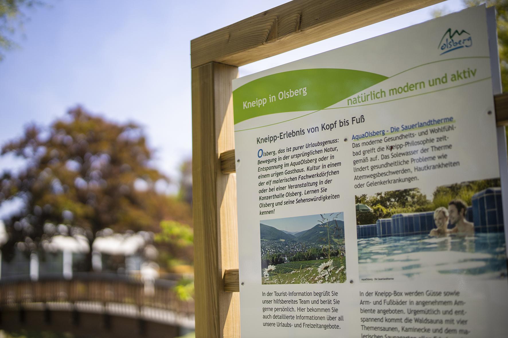 Im Kneipp ErlebnisPark Olsberg werden mit verschiedenen Angeboten die fünf Kneipp-Elemente Balance, Wasser, Bewegung, Heilkräuter und Ernährung aufgegriffen. Die Beobachtungstation an der Ruhraue ermöglicht eine punktuelle barrierefreie Annäherung ans Wasser über eine Brücke mit Beobachtungsplattform und lädt dazu ein, die Themenfelder aus der Gedankenwelt Sebastian Kneipps zu entdecken.