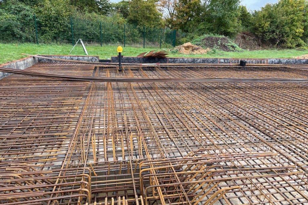 Baustelle mit Baggern, Baukränen und unfertigen Betonwänden; im Vordergrund liegt pinke Dämmung, während Arbeiter und Maschinen im Hintergrund am Rohbau arbeiten.